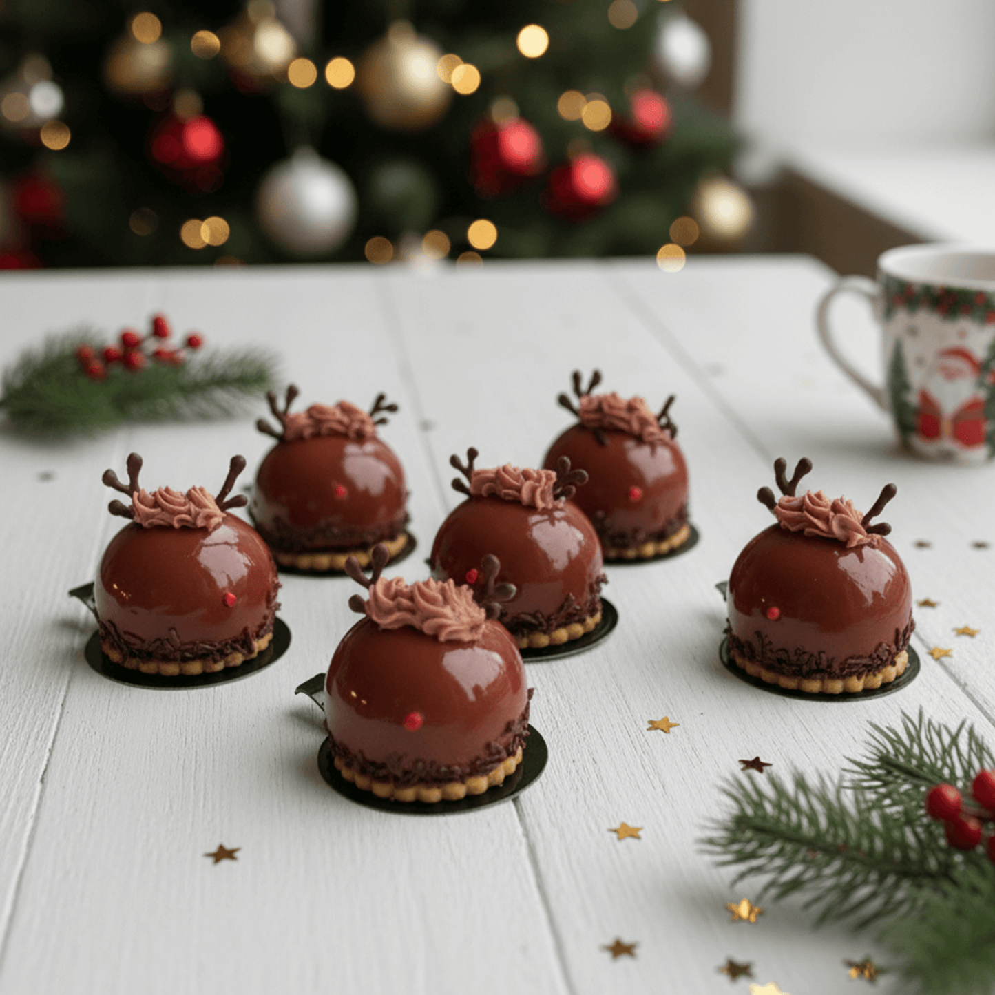 Lovingly made by hand, this elegant dessert combines blueberry mousse with blueberry insertion, Belgian chocolate mirror glaze, chocolate ganache piping, Chocolate antlers, Chocolate Red nose, biscuit beneath the dessert.
