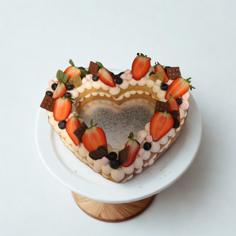 Honey cake are kind of gingerbread cookie, soft sponge heart shape delicious honey sponge with two nice layer of cheese cream having Raspberry insertion and decorated with strawberry, blueberries and pieces of chocolate