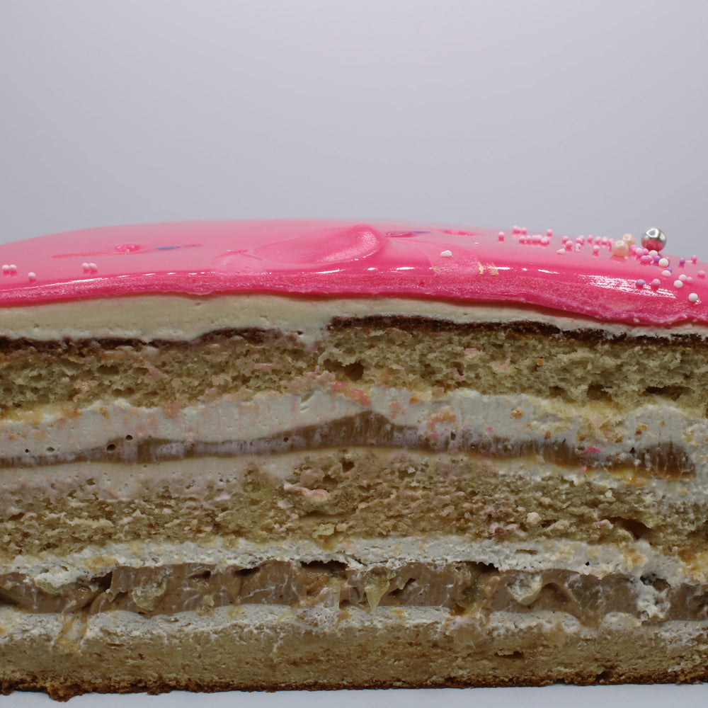 Soft chocolate sponge filled with peanut butter cream, caramel insert and roasted peanuts.
